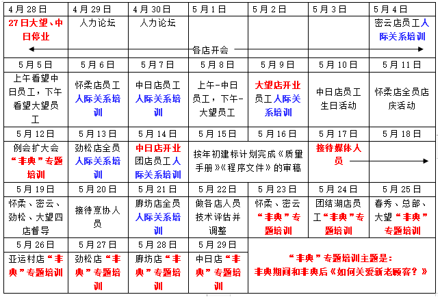 公司人力資資源部是全員練內功的組織方,如下日程安排源自當年真實(shí)的資料(僅展示4月28日至5月29日):